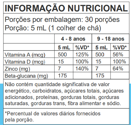 Alta concentração de vitaminas A, D, zinco e bioativo beta-glucana, nutrientes essenciais para saúde imunológica das crianças.